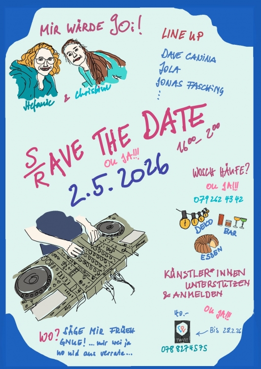 Samstag 02.05.2026 Sounds by Dave Jola und Jonas Fasching Geburi Rave 45 Stefanie & Chrigi Ein privater Anlass im Graber Klicke um zu Zoomen Ab 16. Uhr bis früh